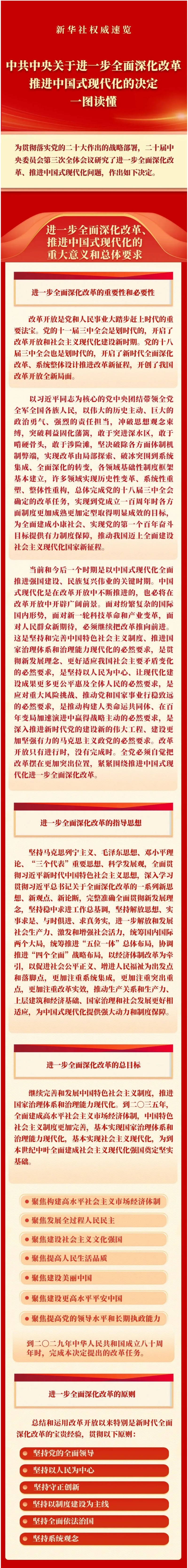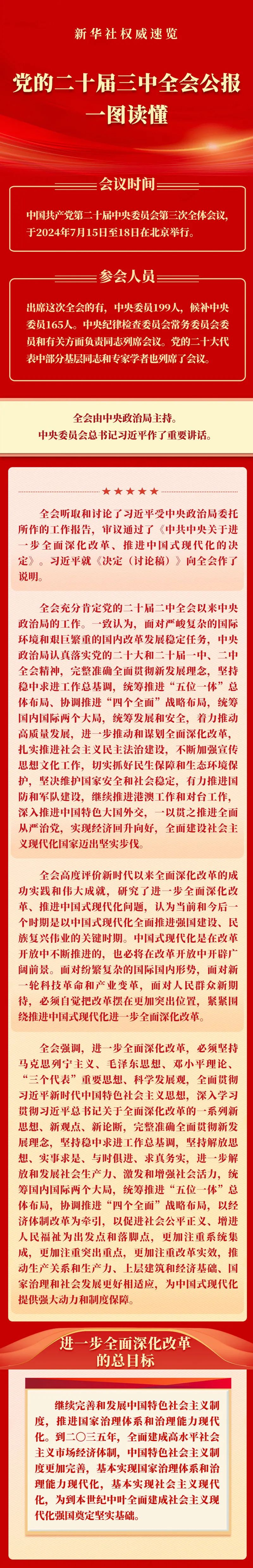 中共中央關于進一步全面深化改革 推進中國式現(xiàn)代化的決定 (2024年7月18日中國共產(chǎn)黨第二十屆中央委員會第三次全體會議通過) 為貫徹落實黨的二十大作出的戰(zhàn)略部署,二十屆中央委員會第三次全體會議研究了進一步全面深化改革、推進中國式現(xiàn)代化問題,作出如下決定。